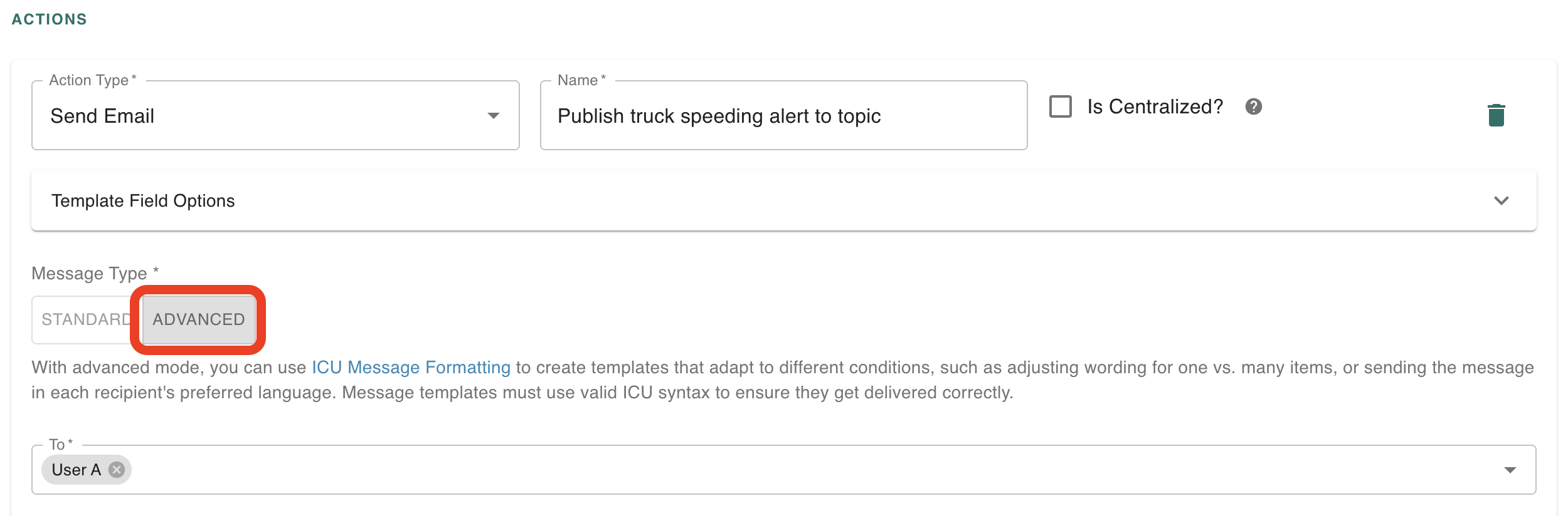 Messages attached to actions can be configured to use ICU Message Formatting. This is done by toggling the Message Type button group to Advanced when configuring the action:
