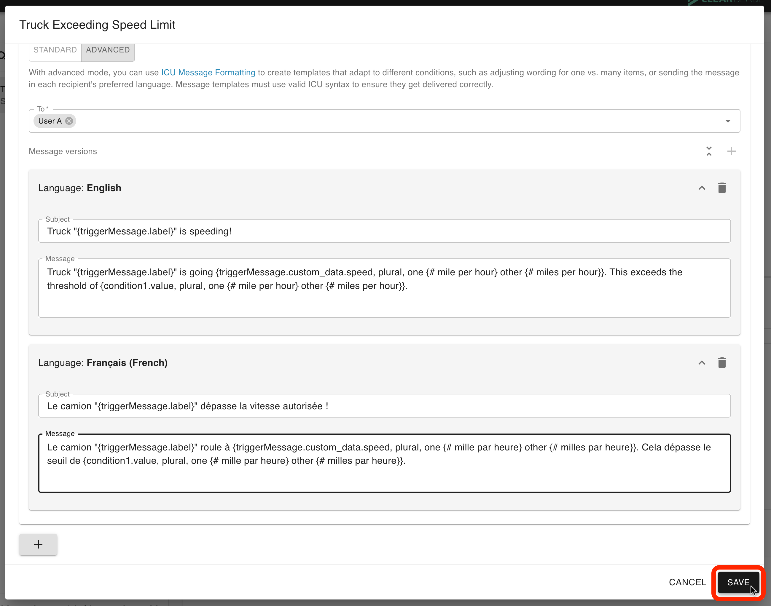 With these pattern strings, the action’s message will adapt its own grammar to fit the values of the variables passed, in this case triggerMessage.custom_data.speed and condition1.value.