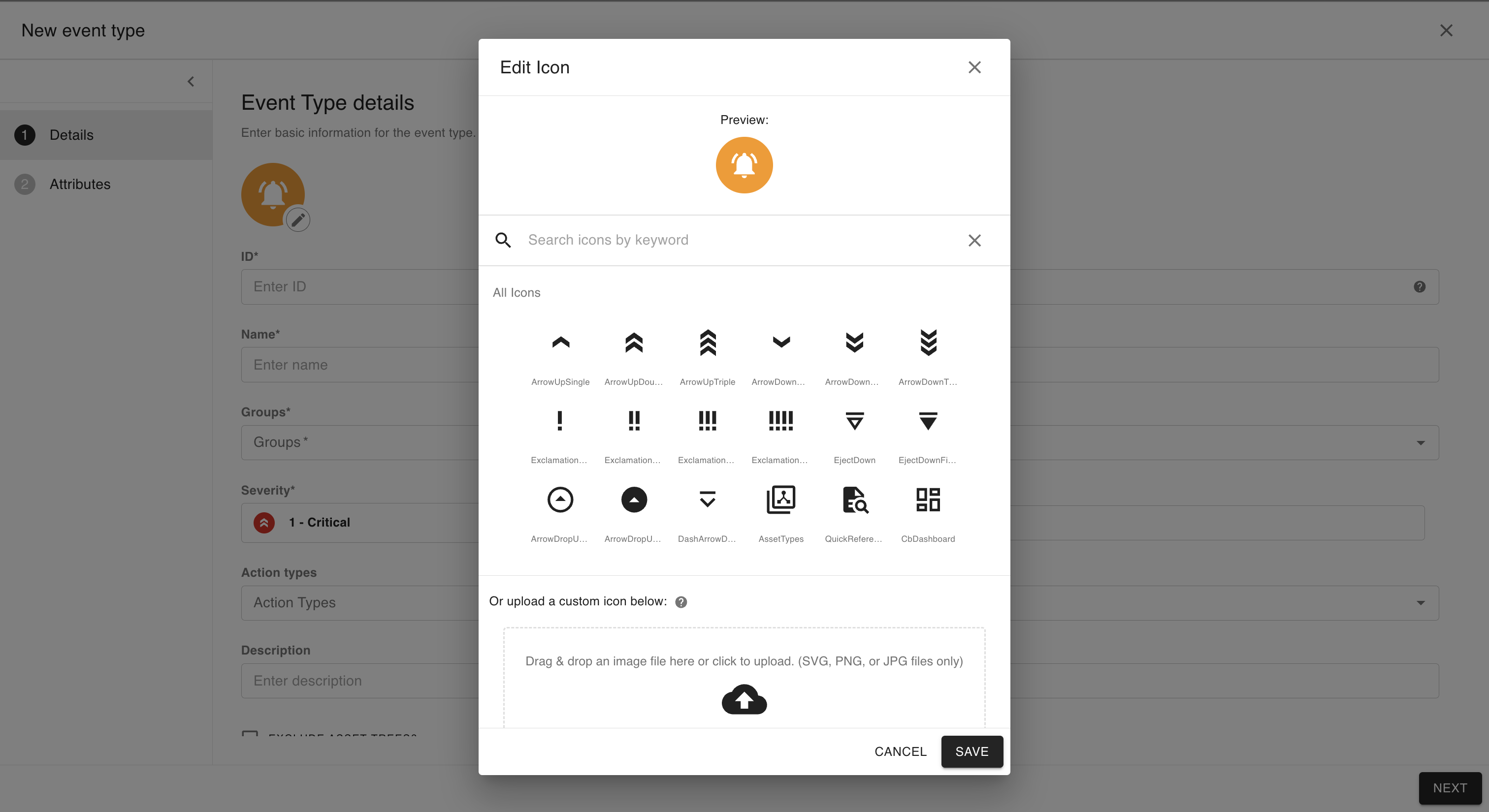 In the event type edit modal, select an icon for your event type and then click Save.
