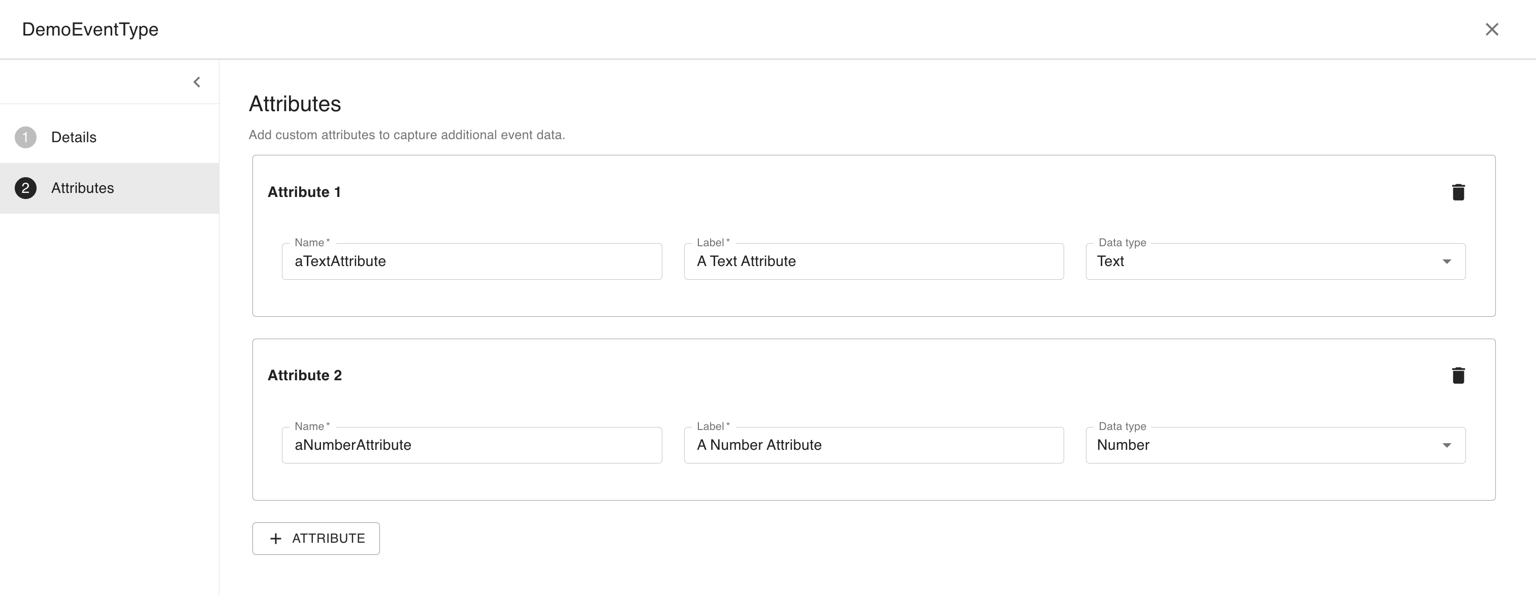 Select the “Attributes” tab to add custom attributes to your event type. These attributes allow you to store additional data on events that are created.