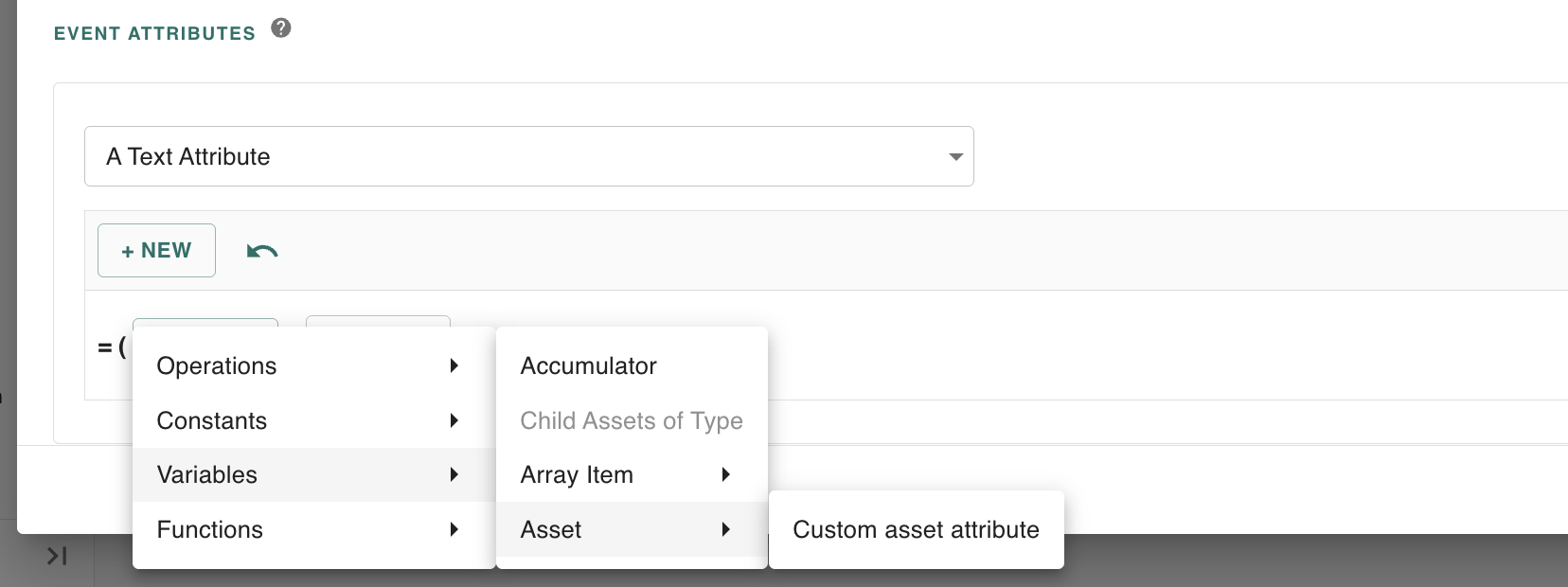 You must determine how the value of your attribute is attained using the formula builder. If you would like to reference custom data from your assets in your formula, you can select Variables > Asset > Custom asset attribute. Then input the id of your custom asset attribute.