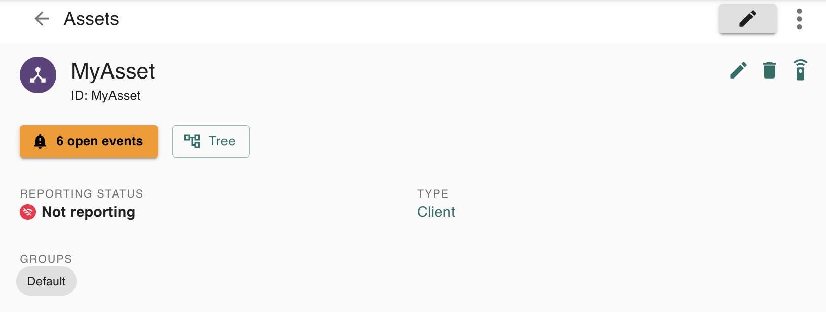 If you have configured a reporting interval on your asset type for the entire asset, your asset will display a Reporting Status icon indicating whether it has reported within that expected interval.