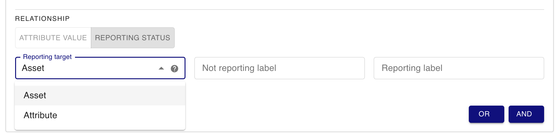 When configuring your rule type, you will select the Reporting Status option. You can choose to check whether the entire asset’s last updated status, or you can choose to monitor when a particular attribute was last updated.