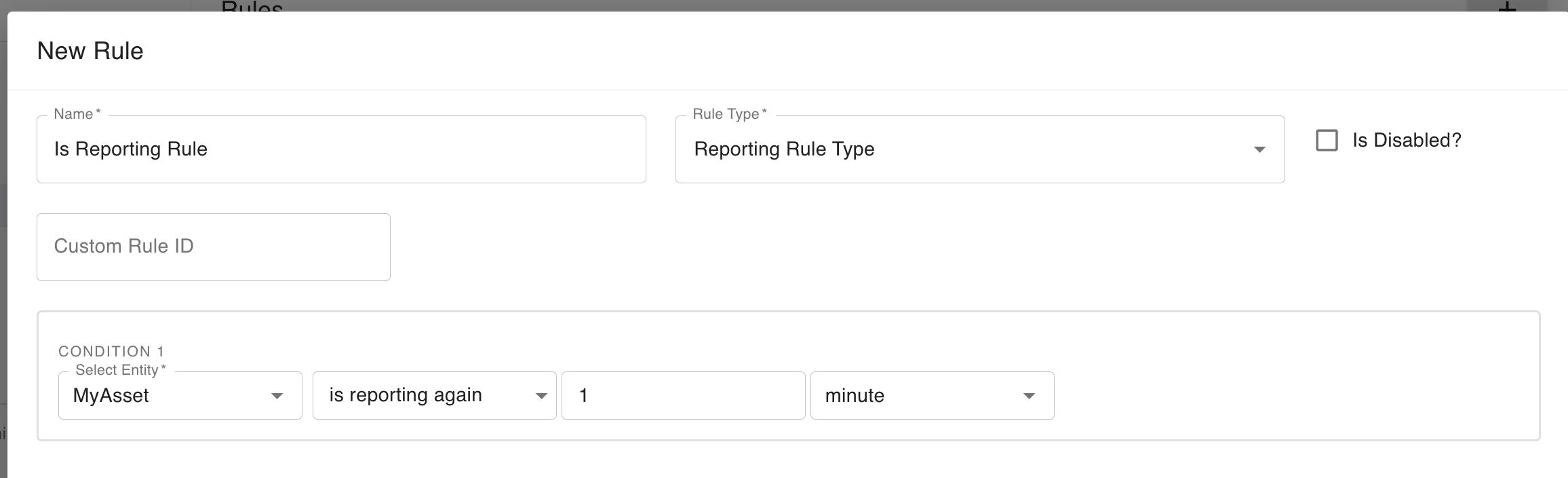 A rule that checks whether your asset or attribute has begun reporting again for a specified duration. This is based on an asset’s reporting status going from “not reporting” to “reporting” and maintaining “reporting” status for the specified duration. In order to maintain reporting status, the asset must check in at the rate specified by your asset type’s expected reporting interval.