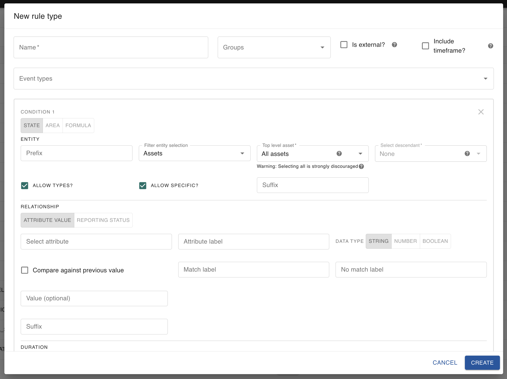 A Rule type defines a class of rules that generate events of a common Event type. Rule types define the conditions that attributes of specific Assets or Asset types must satisfy for the associated rules to generate events. Rule types can include a DURATION that designate how long conditions must persist for events to be generated. Rule types can also include a TIMEFRAME that designate a time window during which rules can generate events.