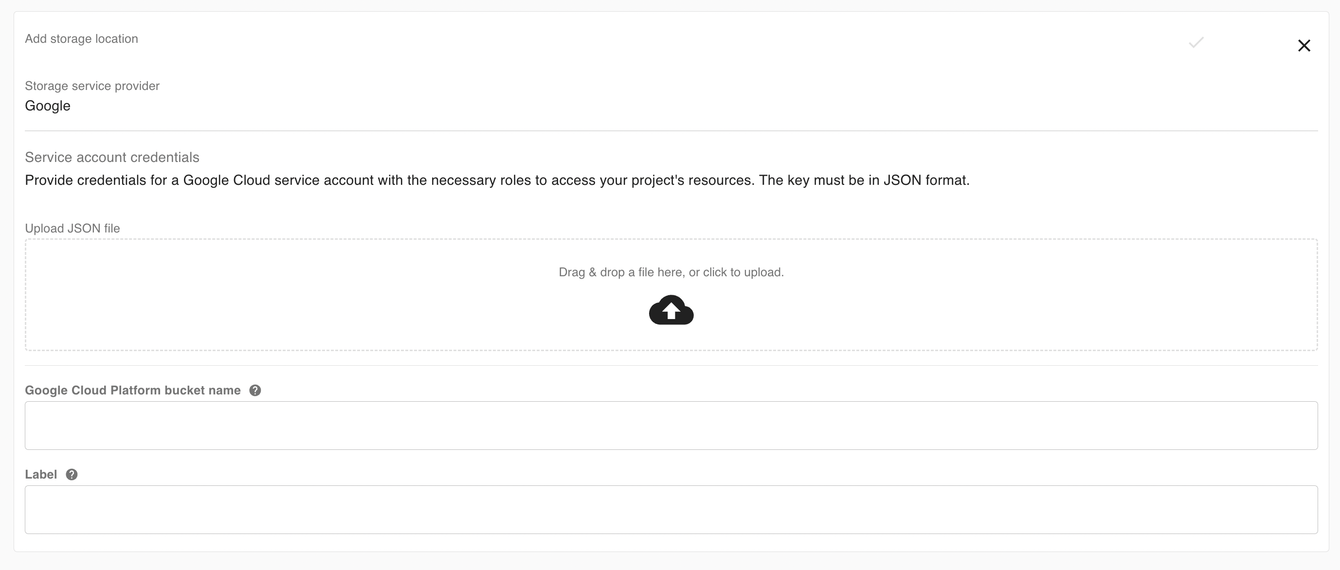 Upon clicking the Add button, you will be met with this menu. You will need an access key JSON file from Google Cloud Platform. If you need to generate this file in GCP, continue onto the next steps; otherwise, skip to step #7.