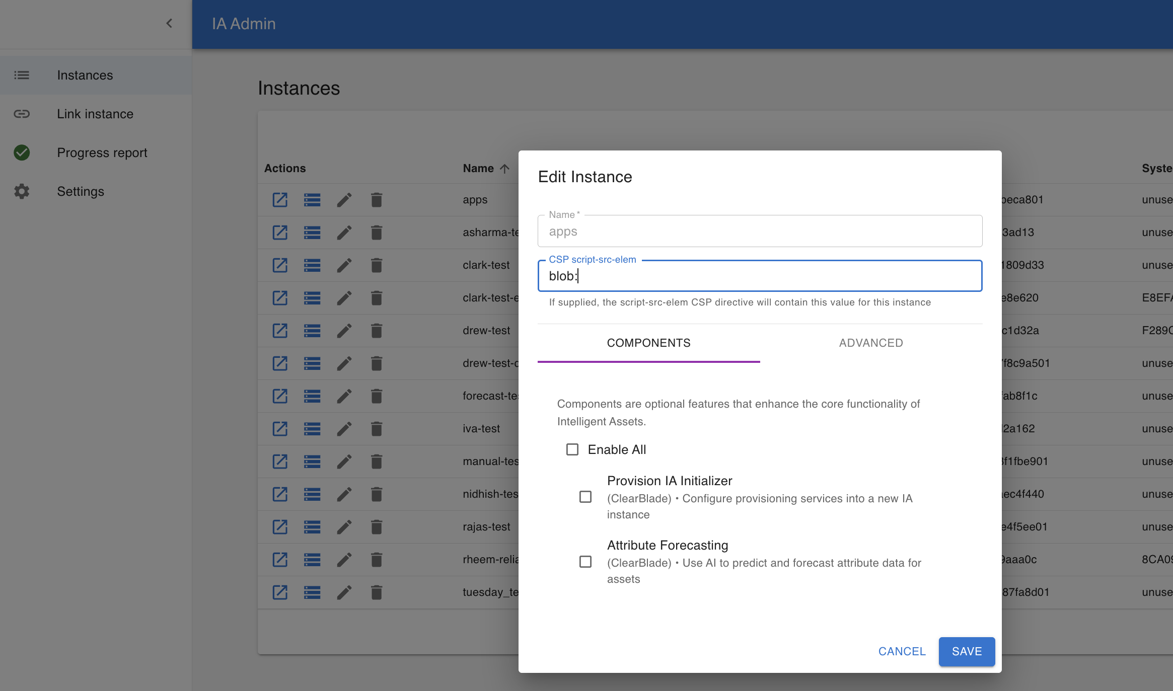 You will need to modify your CSP settings in order to load private mfes. To do this, open up the IA admin UI by navigating to https://<YOUR_URL>/ia-admin. Then click the edit icon for the instance you would like to modify, and add