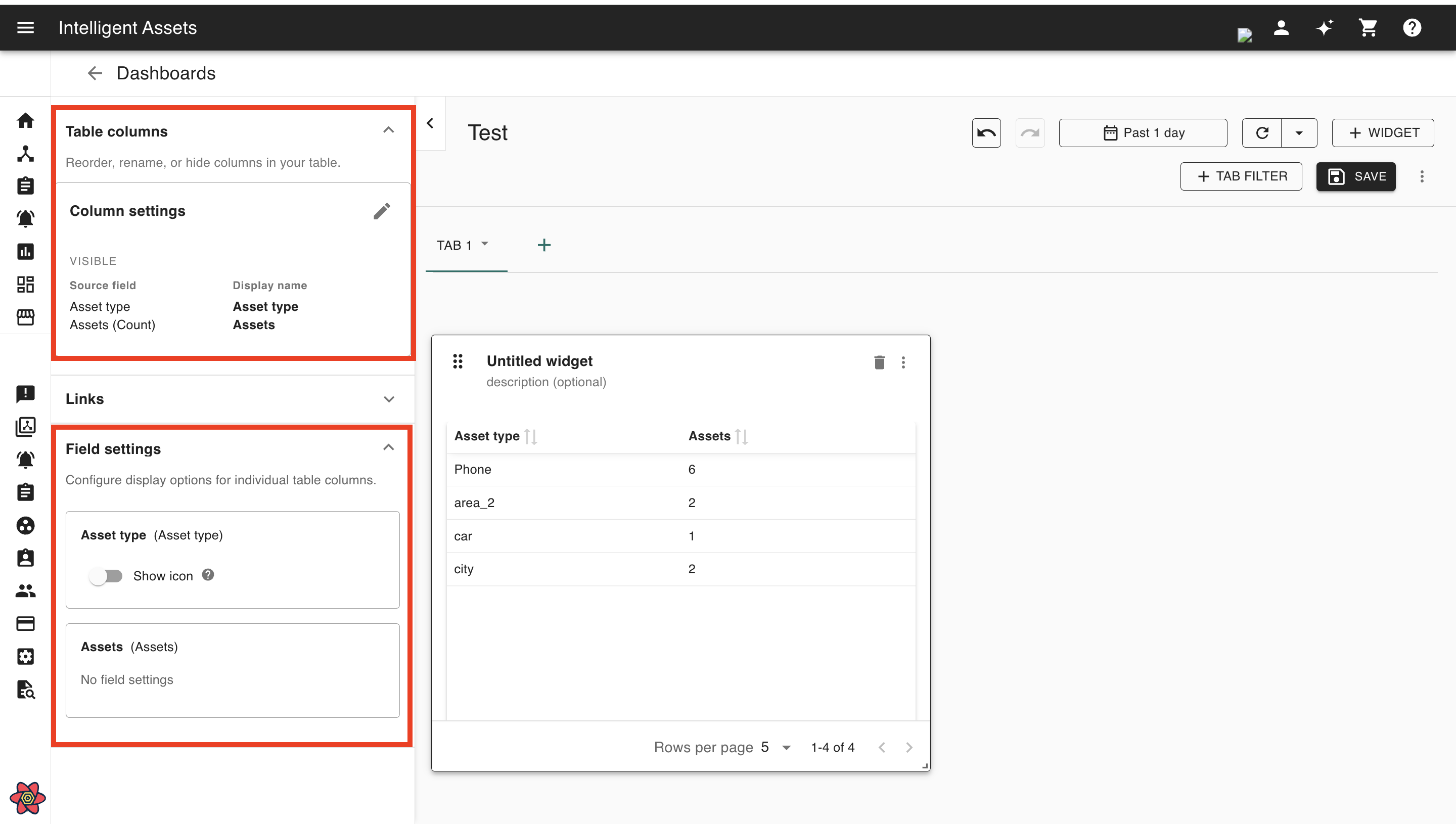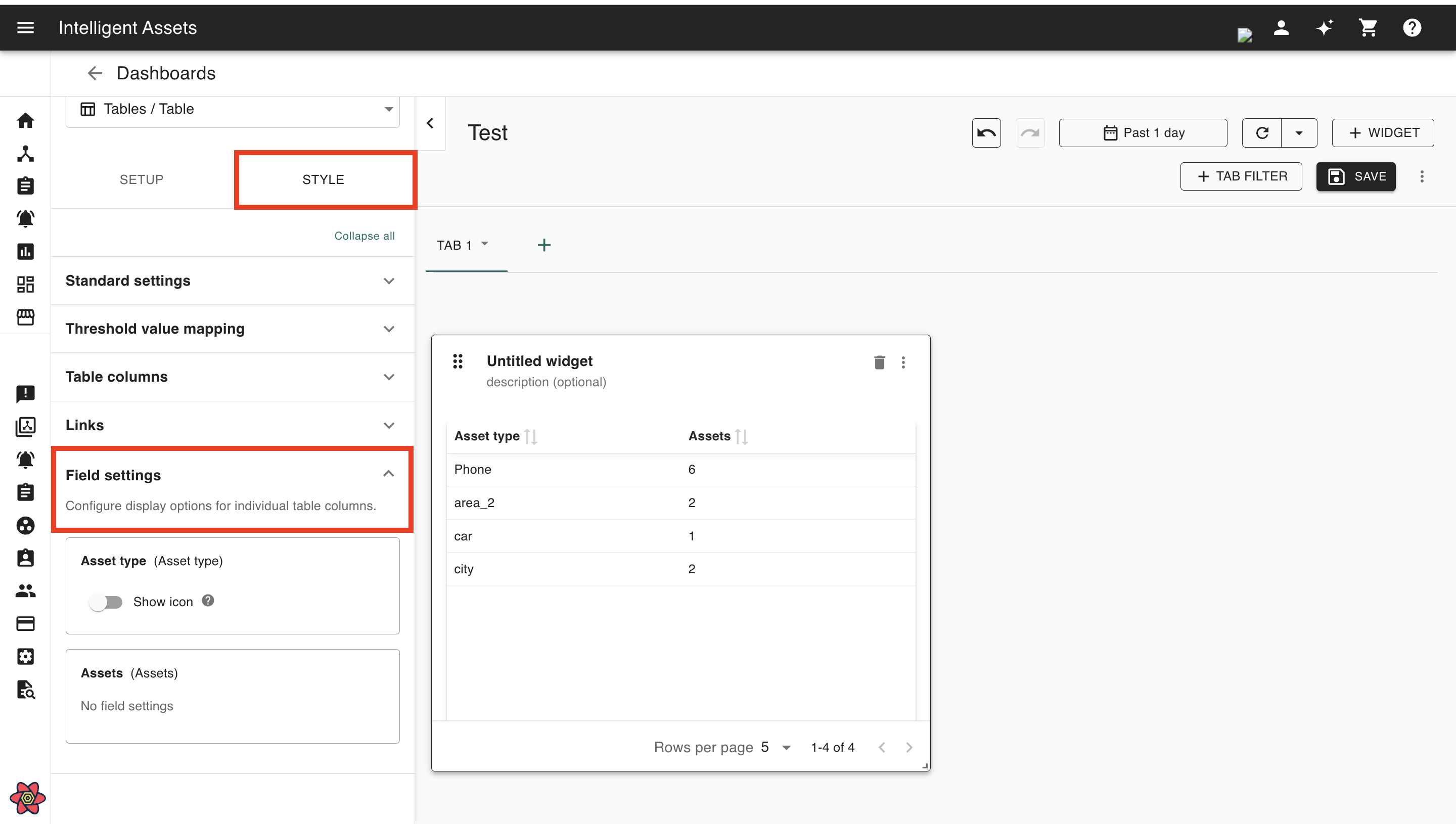 The field settings allow users to configure assets, asset types, events, event types, and event severity columns to display their respective icons on the dashboard table.