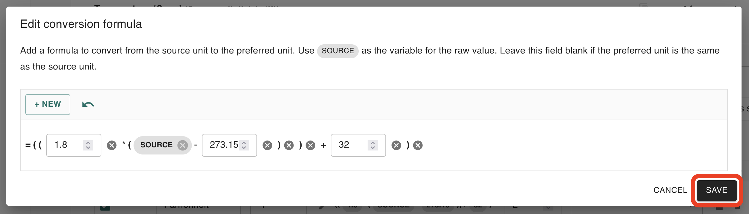 To define the conversion formula from Kelvin to Fahrenheit, we begin by defining the outermost operation (______ + 32). To do this, click the + NEW button, then select Operations > Arithmetic Operations > Add (+):