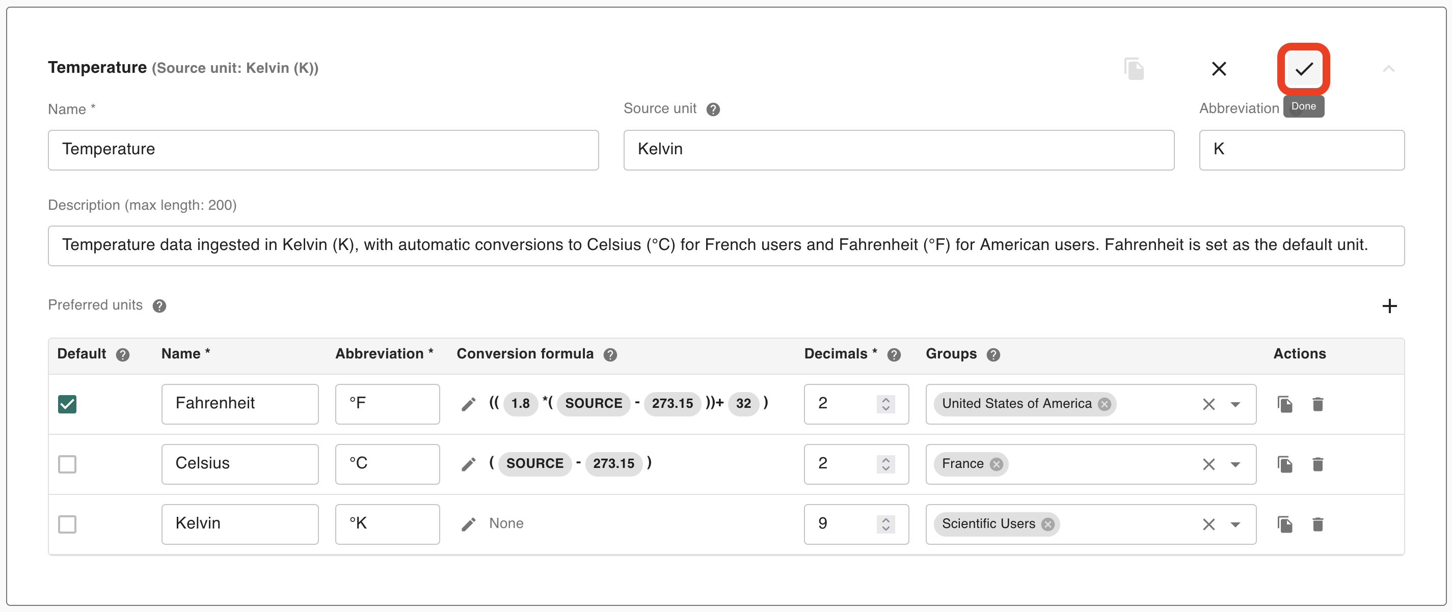 Preferred units define how data is converted for each user depending on their settings and groups. A user based in the United States would likely prefer to see temperature conveyed in Fahrenheit, whereas a user based in France would prefer the same information presented in Celsius. Preferred units are used to define conversion formulae for each unit, as well as other important information on each unit including its name, abbreviation, number of decimals for rounding and attributed groups.
