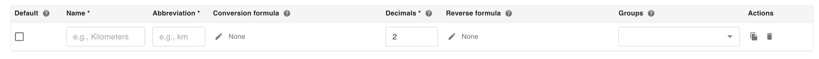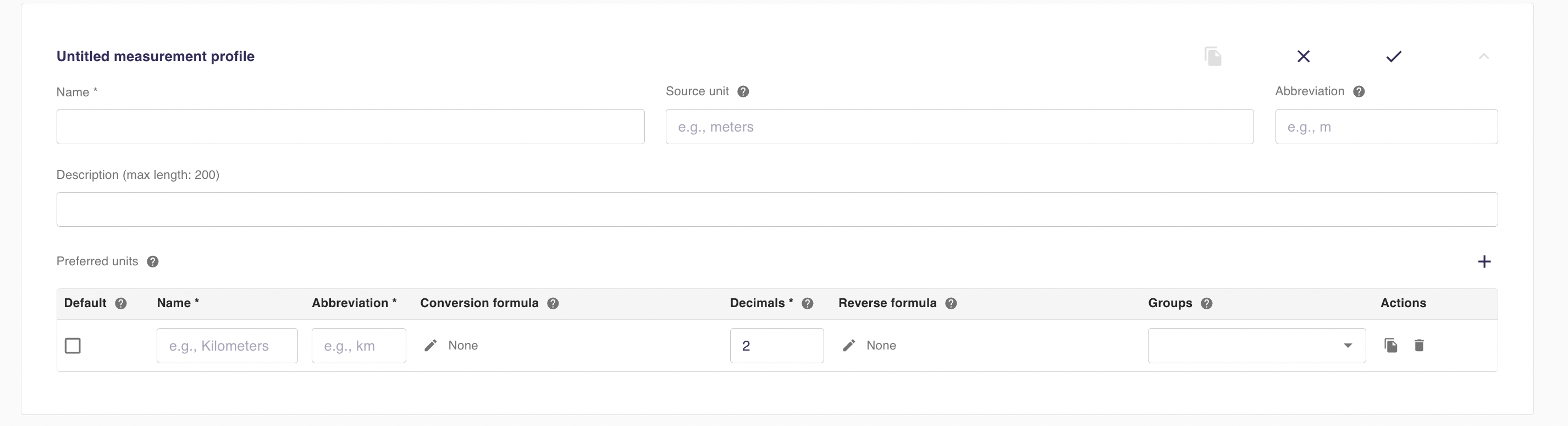 When editing a measurement profile, the Actions that appear in the rightmost column of the Preferred units table can be used to copy or delete a preferred unit.