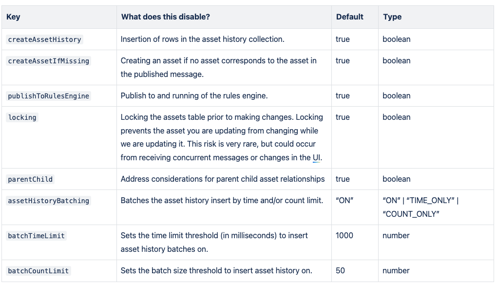 CODE{ ... "asset_location_status_options": { ... "createAssetIfMissing": false, "assetHistoryBatching": "TIME_ONLY", ... }, ... }