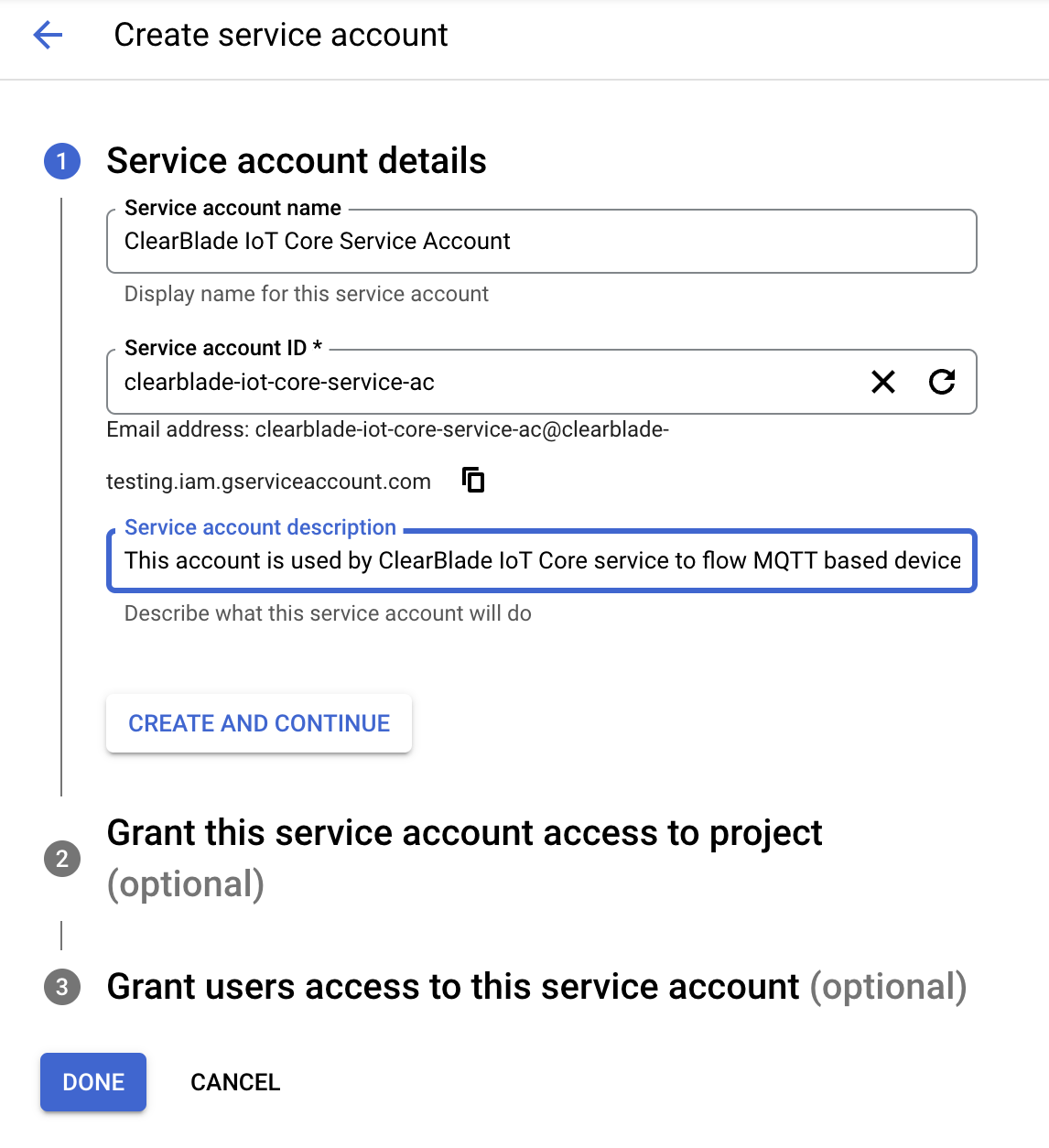 b. Account description: This account is used by ClearBlade IoT Core service to flow MQTT-based device message data into the Google Pub/Sub offering. It additionally integrates with Cloud Logging and Cloud Monitoring services.