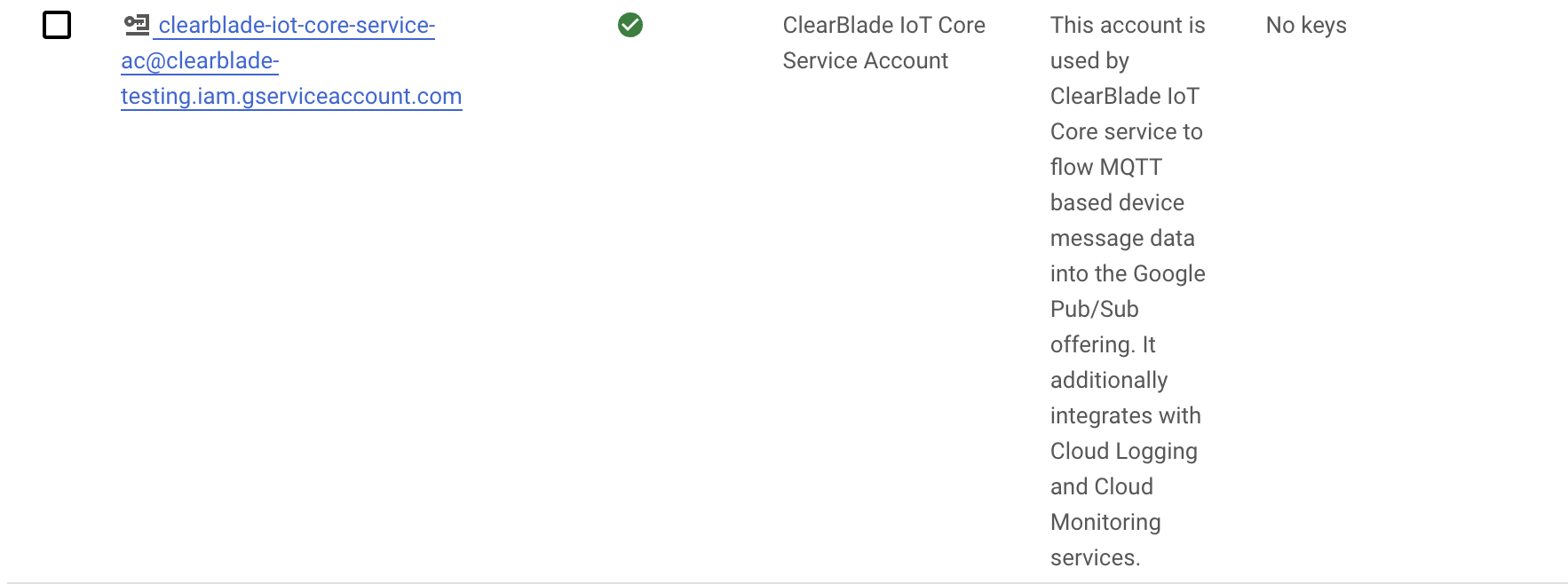 b. Account description: This account is used by ClearBlade IoT Core service to flow MQTT-based device message data into the Google Pub/Sub offering. It integrates with Cloud Logging and Cloud Monitoring services.