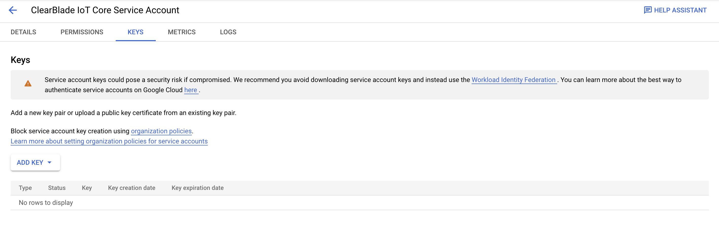 ii. This role is needed to allow the ClearBlade IoT Core console to browse and create new topics in Google Pub/Sub to send events and status updates. This role is needed for normal operations.
