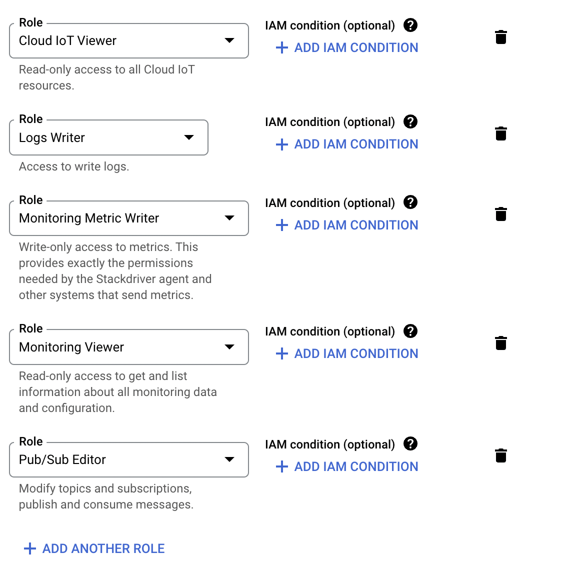 a. Cloud IoT Viewer: This role is needed to migrate IoT Core registries only. It can be removed once a migration is completed.