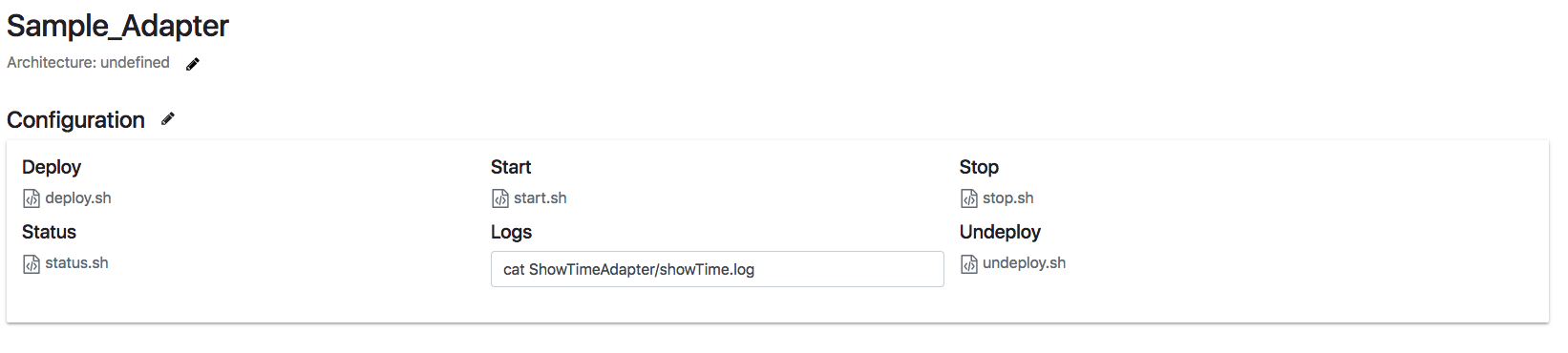 To prevent naming collisions resulting in overwritten files, it is recommended that adapter files be copied to an adapter-specific directory. The files can be copied using a shell command or script. A shell script to accomplish tasks needed for deployment must be included as one of the adapter files in the command’s file section. You should provide an archive/zip file containing all the files required to execute and manage an adapter. The deploy command would be a shell command to extract the archive’s contents, for example:
