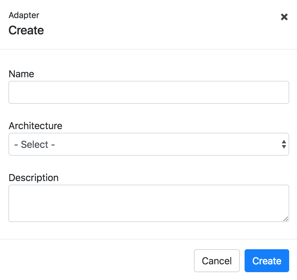 3. Enter the adapter's name, architecture, and description, and click Create. Adapter names must be unique within a system.