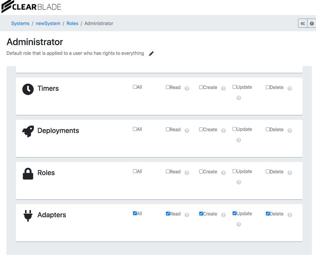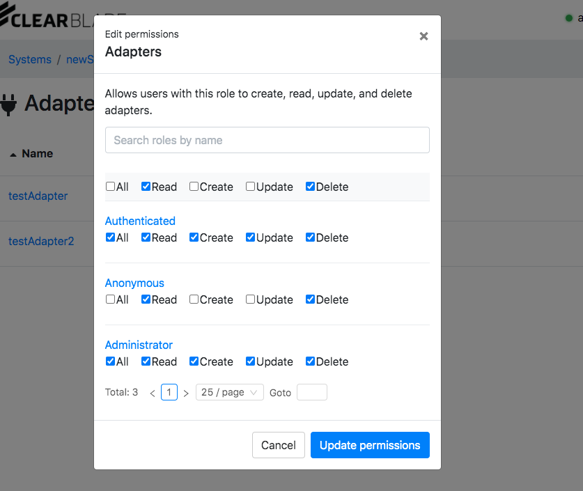 CRUD (create, read, update, and delete) permissions can be added to adapters for individual roles: