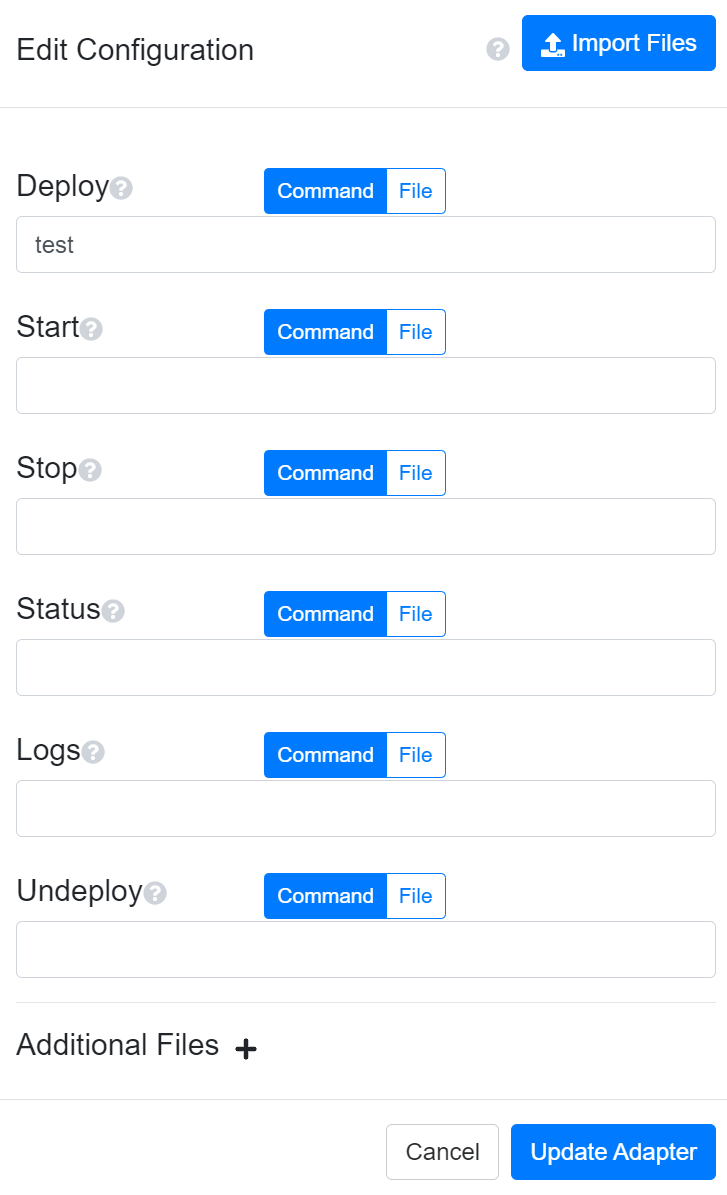 When configuring an adapter, you can add, modify, and delete adapter files and modify the adapter’s commands. Files are optional for storing executable commands and can be downloadable. A command to execute the file must be provided if you elect to store commands inside files.