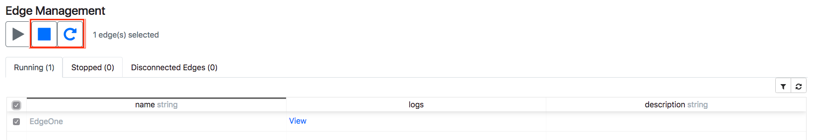 A command or shell script will stop the adapter on a ClearBlade Edge. The stop command is optional. If the stop command is not specified, the adapter must be manually stopped by connecting to the gateway device (via SSH) and issuing an appropriate stop command. An adapter can be stopped or restarted from the Edge Management table’s Running tab on one or multiple edges.