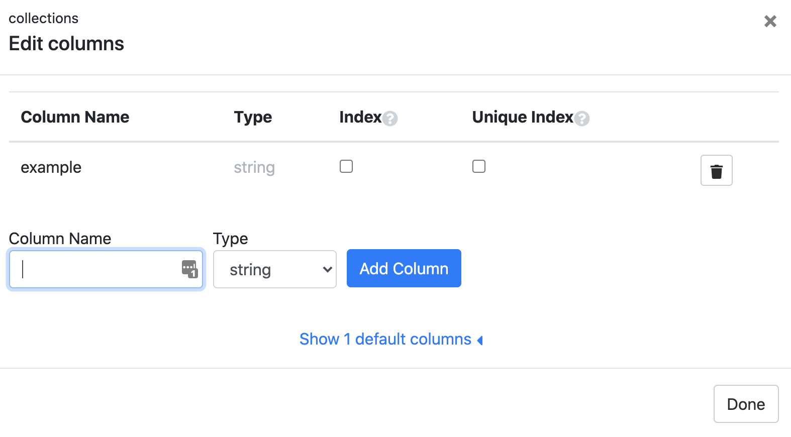 Collection columns can be indexed to speed up certain database operations. Unique indexing allows unique values to be used. The async library for indexing can be found under the Collection section. To configure indexing, go to the Edit column in a collection and mark the indexing box type under the column(s) you choose.