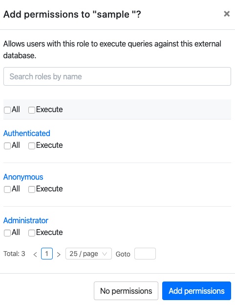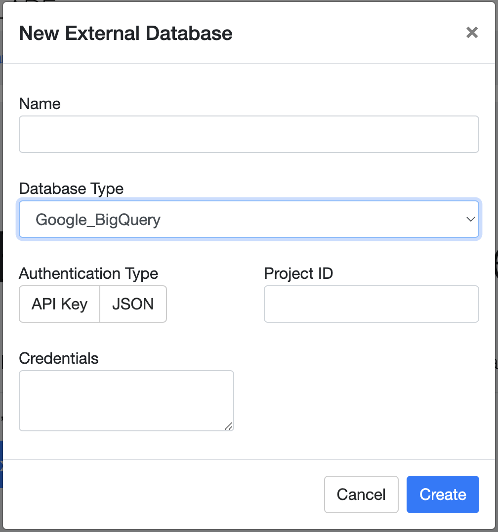 Click + Add External Database, and a modal should appear. Enter the information from the database that you will be using. Not all database types will have the same settings fields. The standard settings fields for all database types are Database Name, IP Address, Port, Username, and Password. Oracle, DB2_Linux, DB2_zOS, DB2_System_i, and Cassandra are currently only supported in on-premise installations.