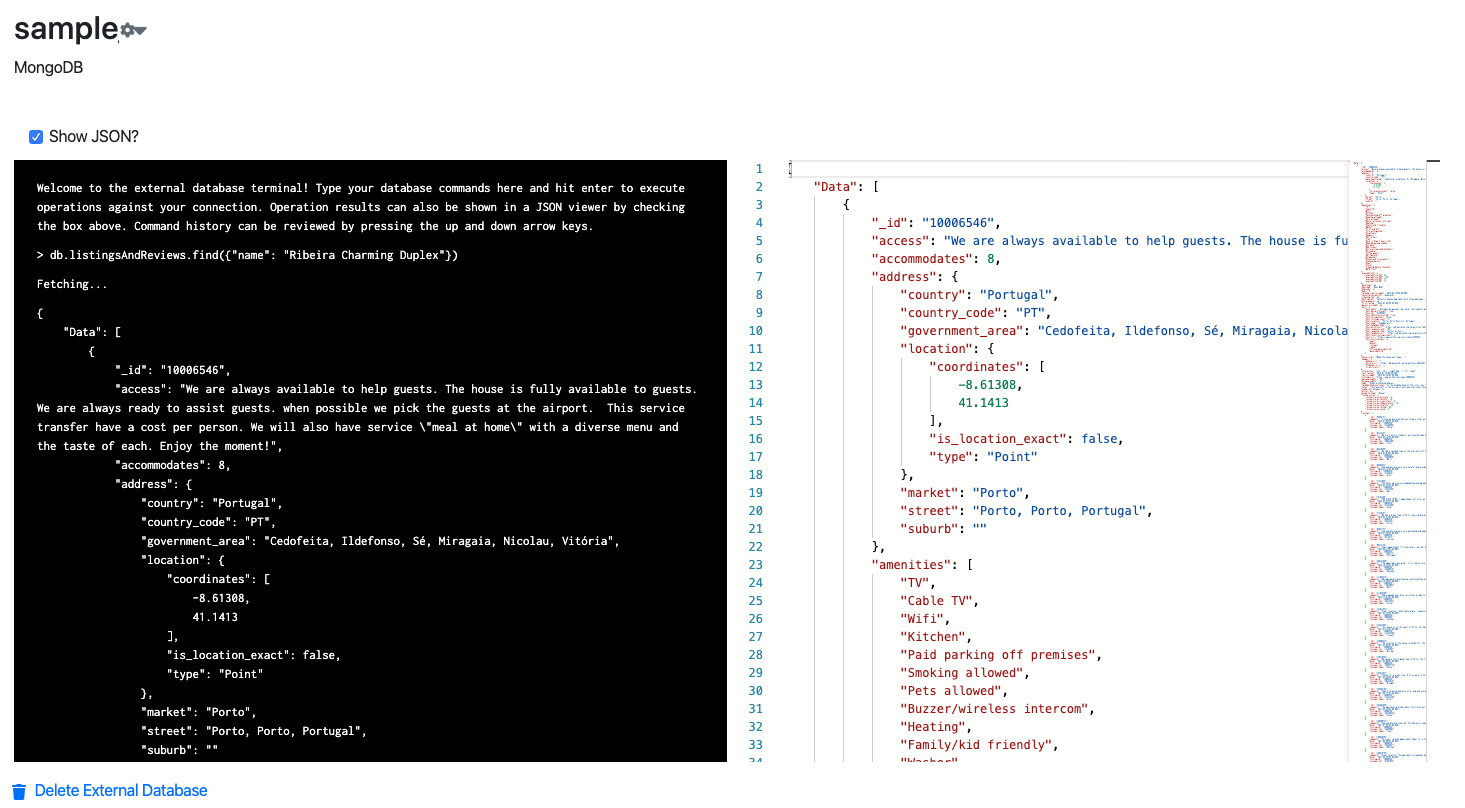 A terminal is available for your database commands and to execute operations against the connection. Results can be shown side-by-side with a JSON viewer when the Show JSON? box is checked.