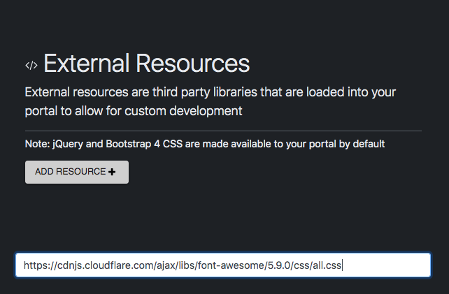 Copy the URL (https://cdnjs.cloudflare.com/ajax/libs/font-awesome/5.9.0/css/all.css) and add it to the box after clicking Add Resource +.
