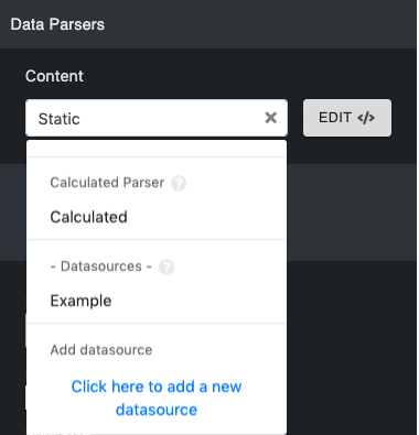 The widget parser can be edited in this section. Datasources can be added.