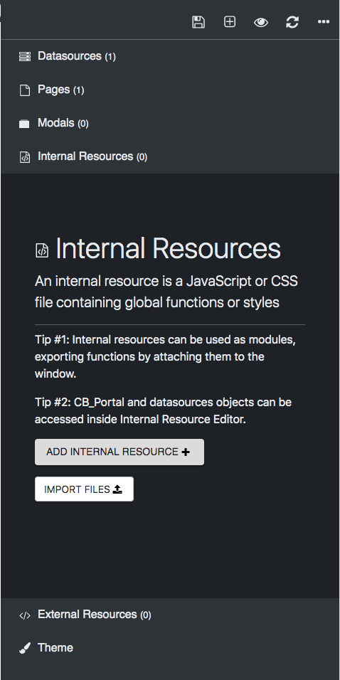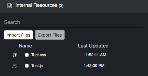 Click Add Internal Resource, and a new file modal will appear. Give your file a unique name, choose whether it is a JS or CSS file, and type in the code. There is an option to test before saving the changes.