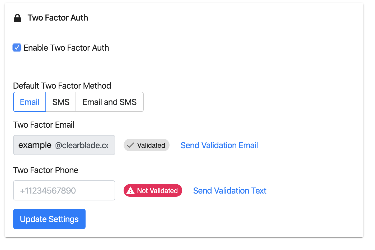 Two Factor Email | An email must be validated before it can receive a login code. The validation status appears next to the email. There is an option to send a validation email |