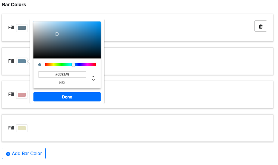 This is used to give each bar a fill color. Click Add Bar Color to add more colors. Hover over colors to reveal the trash can for deletion.