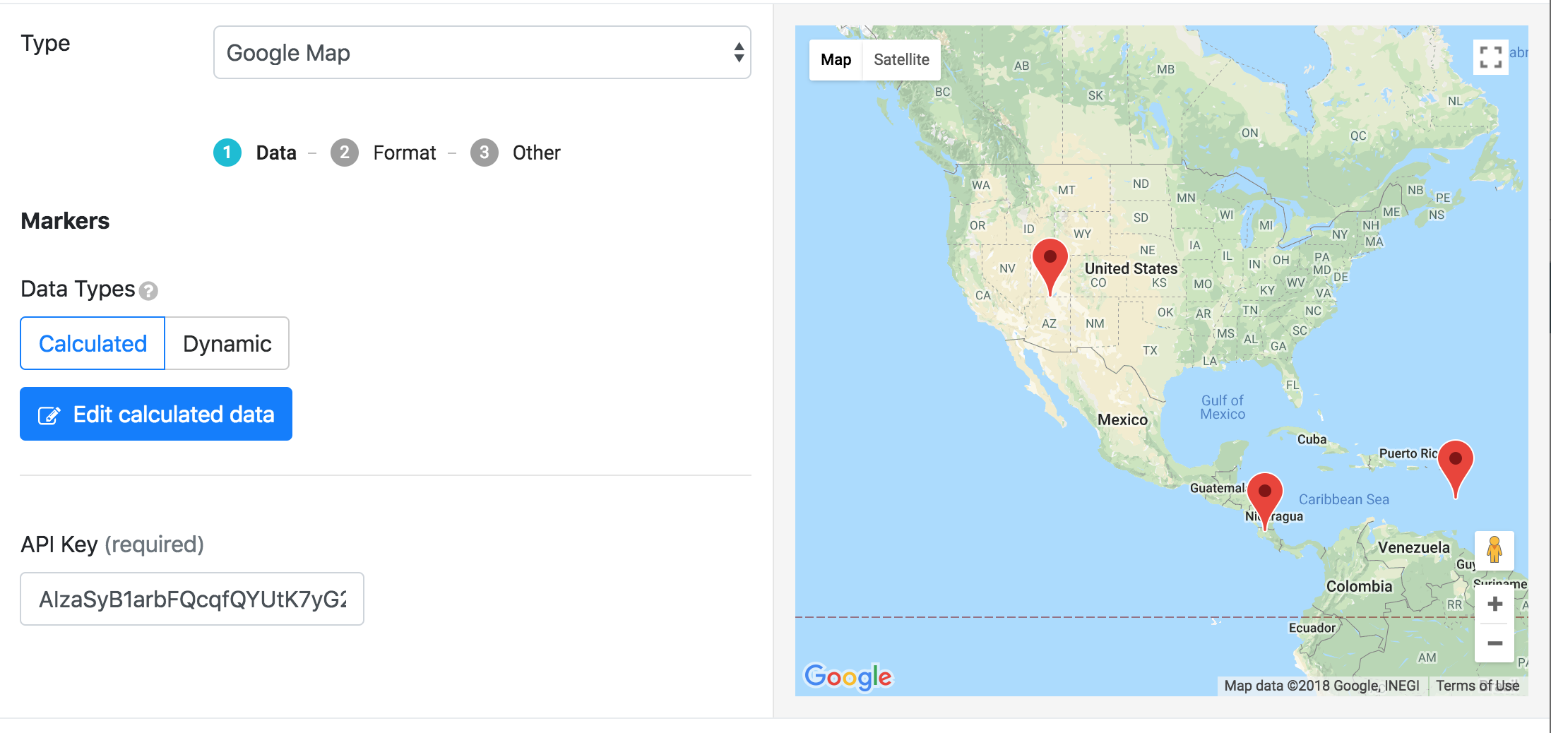 The data on the map is default. To change locations, go to Edit Calculated Data. Retrieve the API Key from your Google Maps account.