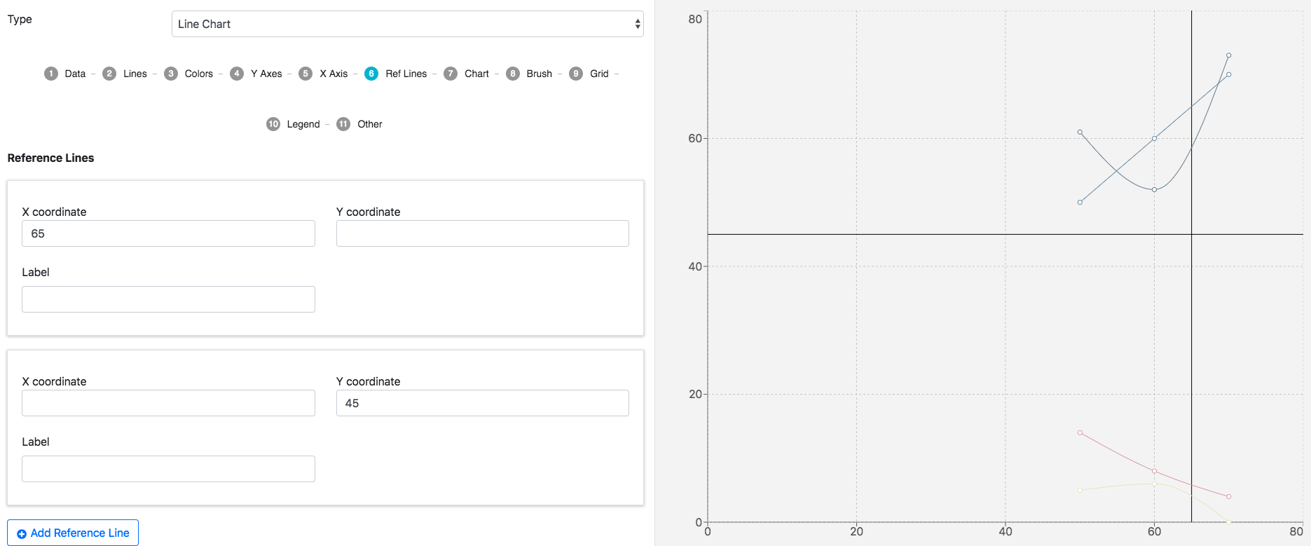X and y-axis lines can be added to define values and compare against the dataset (only one coordinate per reference line window).