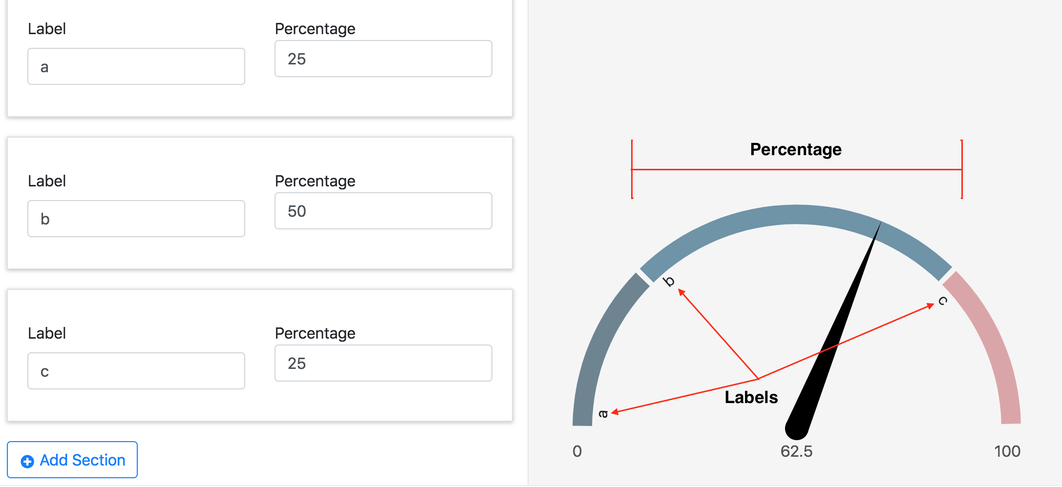Click Add Section to add more sections. Hover over the bar data entry window to reveal the trash can for deletion. The percentages are not cumulative.